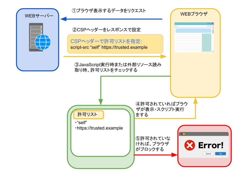 図のように、CSPはWebサーバがレスポンスヘッダーで「読み込むリソースのルール」をブラウザに伝え、ブラウザ側がそのルールをもとに実行可否を判断する仕組みです。